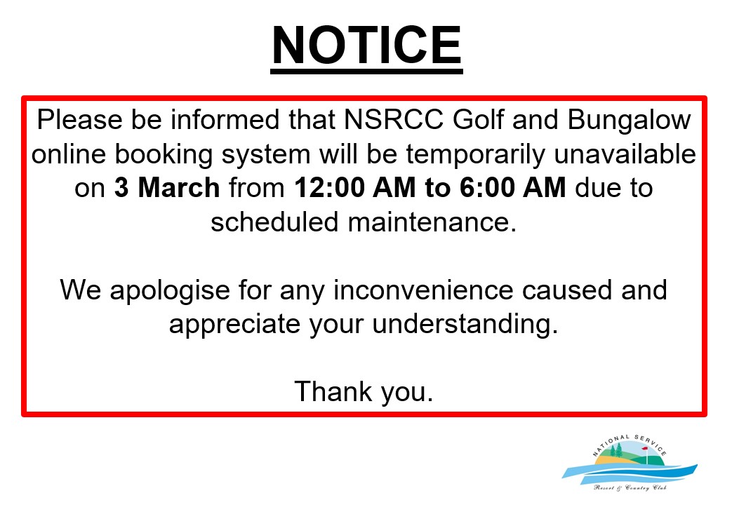 [NOTICE] Golf and Bungalow Online Booking System Maintenance on 3 March