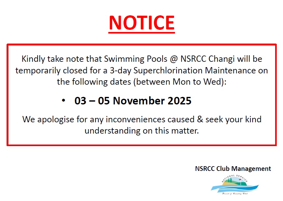 [NOTICE] Swimming Pools @ NSRCC Changi Temporarily Closed for Superchlorination Maintenance (3-5 Nov 2025)