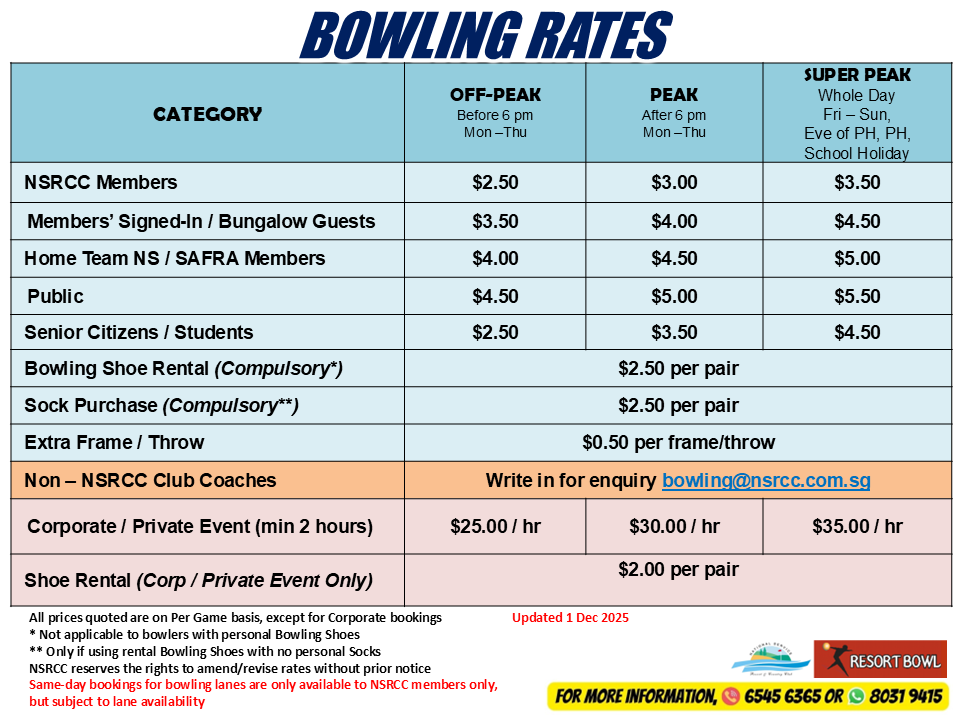 Below are the Bowling Rates for reference. For enquiries, please email bowling@nsrcc.com.sg.