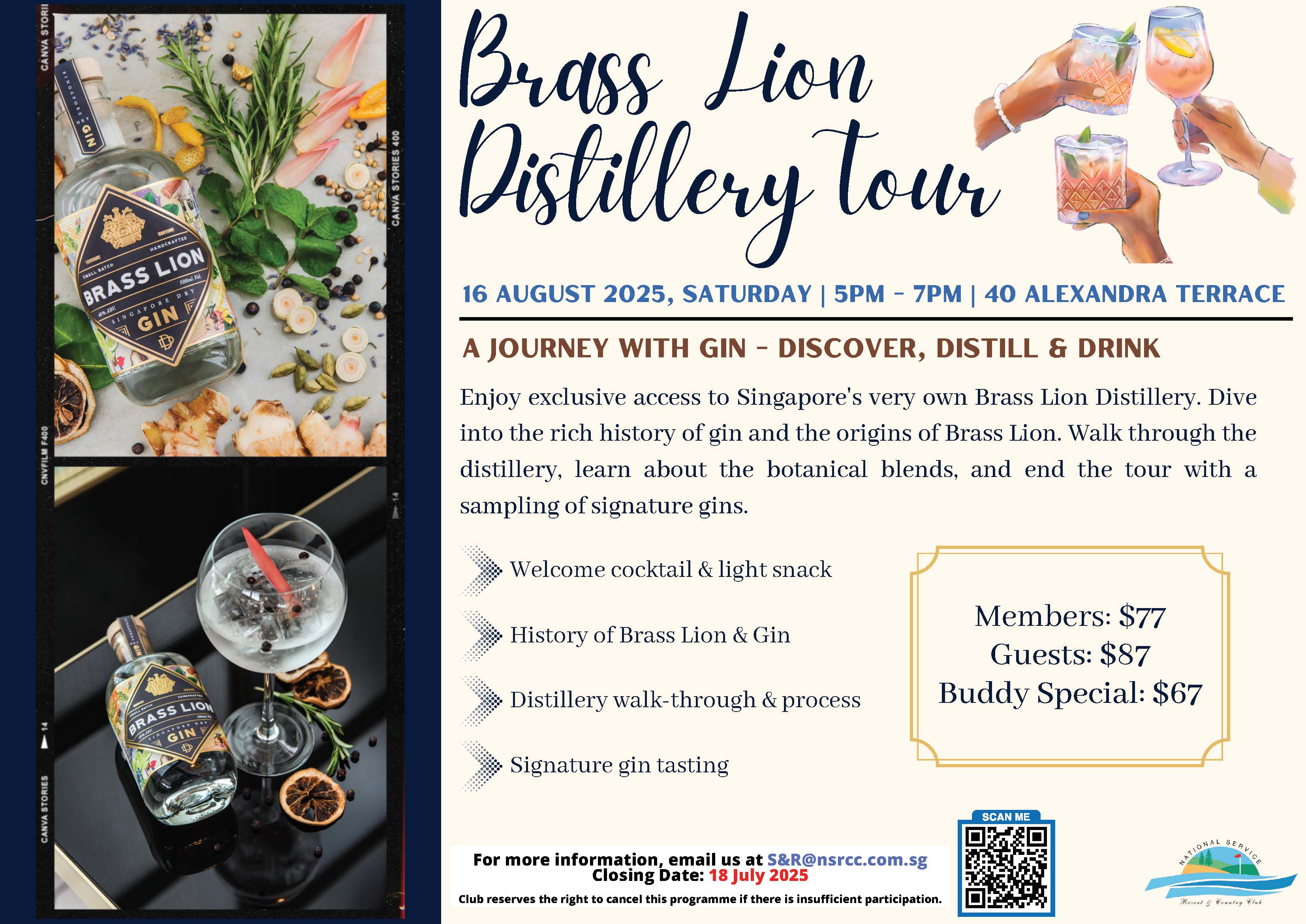 Calling wine aficionados, sommeliers, and enthusiasts, join our Brass Lion Distillery Tour for a journey of discovery and appreciation as you dive into an intriguing world of wine! Delve into a sensory exploration where you experience the visual, sensory, and olfactory functions while appreciating the wines’ rich heritage steeped in history and culture. Learn about the origins of the wine, and their pairing with food. Connect with like-minded individuals in a relaxing setting. Register for this session at https://forms.gle/ssdXwzzKwbV5ws5Q9. To register, email S&R@nsrcc.com.sg. |