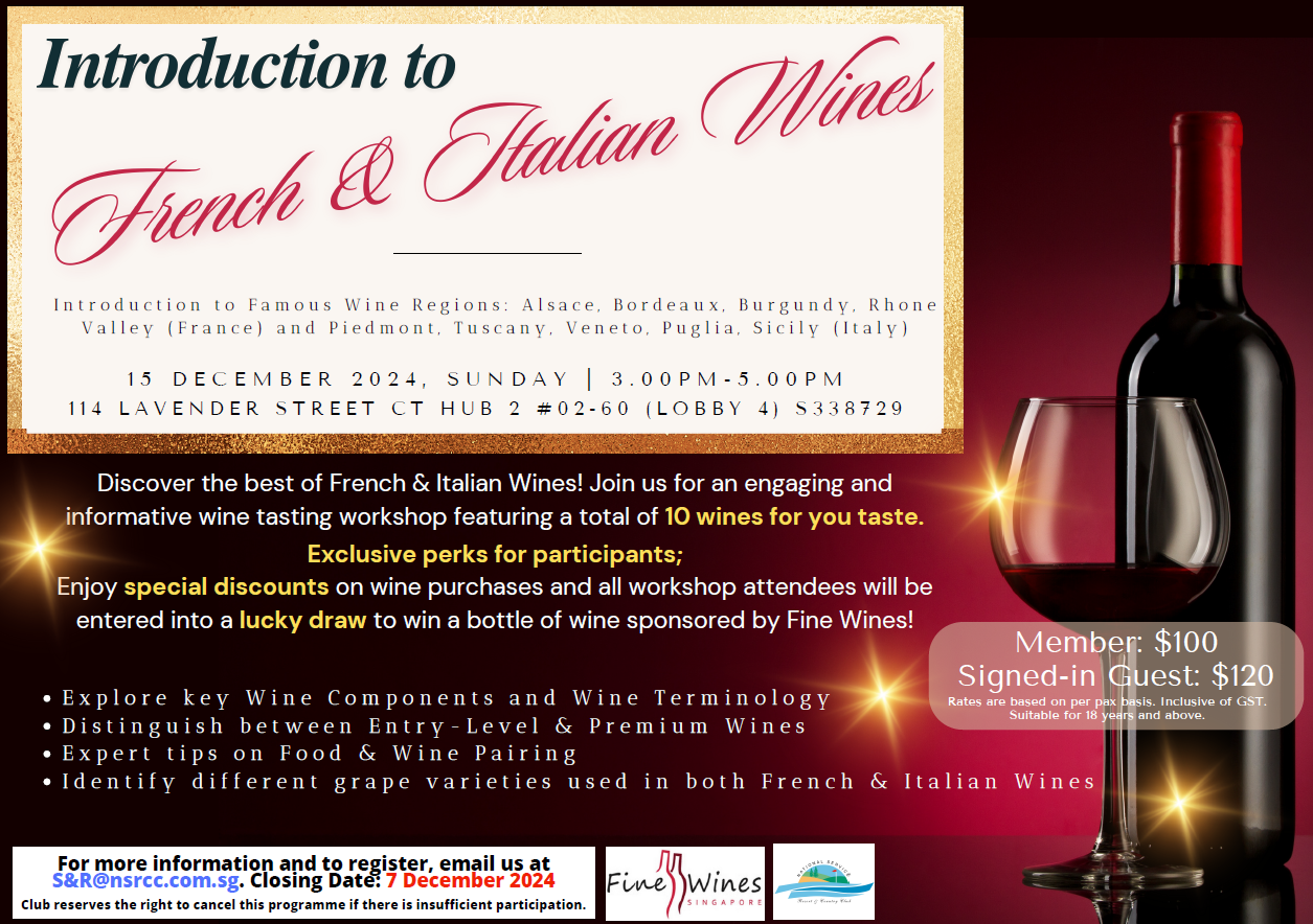 Be acquainted with exquisite wine from famous regions in France and Italy. Get expert tips on food/wine pairing as well as their terminologies and varieties.